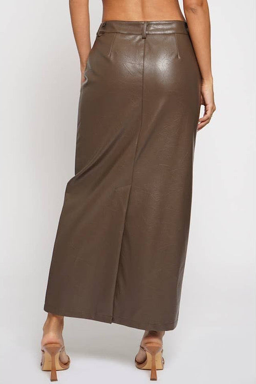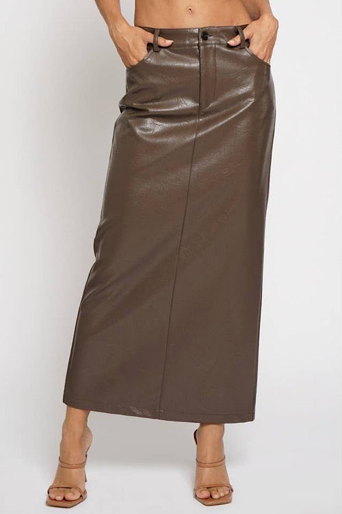 Beautiful pebble faux leather in a rich chocolate hue. Concealed back slit and nice long maxi length. Front pockets and button and zip closure, with belt loops. This piece is gorgeous and perfect to dress up with our sheer leopard bodysuit, or grab a sweatshirt or sweater and sneaker for that causal vibe.