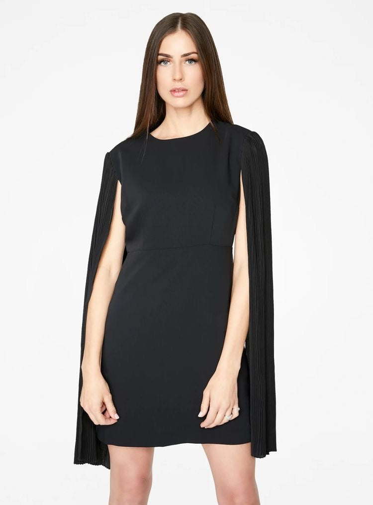 Not your basic black dress! This beautiful, chic black mini dress with exaggerated pleated cape sleeves is a stunner! Fitted bodice and mini length with zip up back. Fits like a glove and the sleeves make the dress!