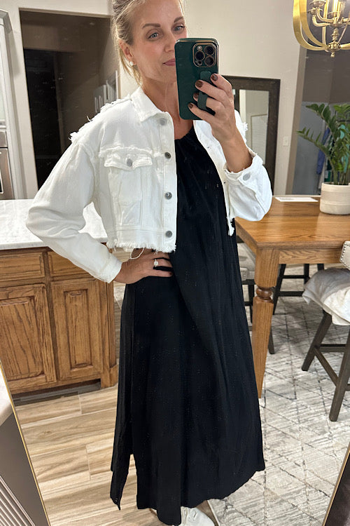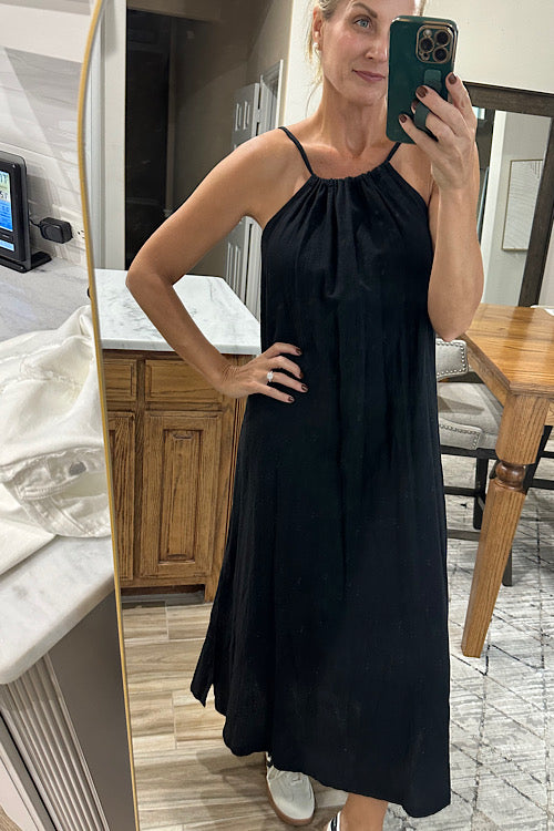 Such a classic basic perfect for Fall! Simple and Chic with an adjustable halter neckline and relaxed silhouette. Maci length with side slits to the knee! Just add your favorite denim jacket or cardigan and some cute sneakers.
