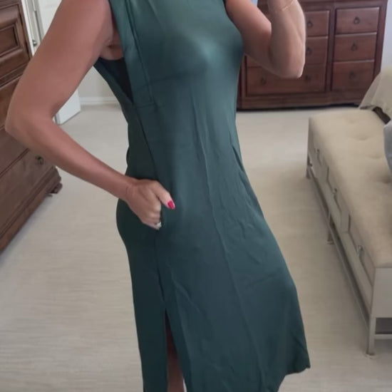 Discover the ultimate comfort and style with our Jersey Knit Tank Dress. This pullover midi dress is made of solid jersey knit, with a side slit hem and convenient pockets for added functionality. Unlined, knit, and lightweight, it's perfect for any occasion. Available in Chocolate and Forrest.