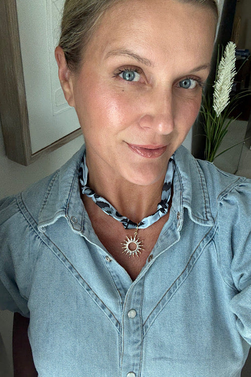 Versatile and stylish, the Leopard Sun Single Charm Scarf Necklace is a must-have statement piece. This best-selling design features a luxurious scarf adorned with a gold-plated CZ charm. Our beautiful scarf necklaces are Handmade in Dallas, TX. This unique accessory is perfect for layering or wearing as a statement piece, adding a chic and meaningful touch to any look.