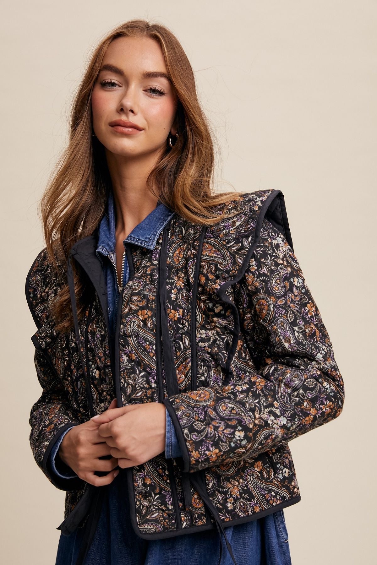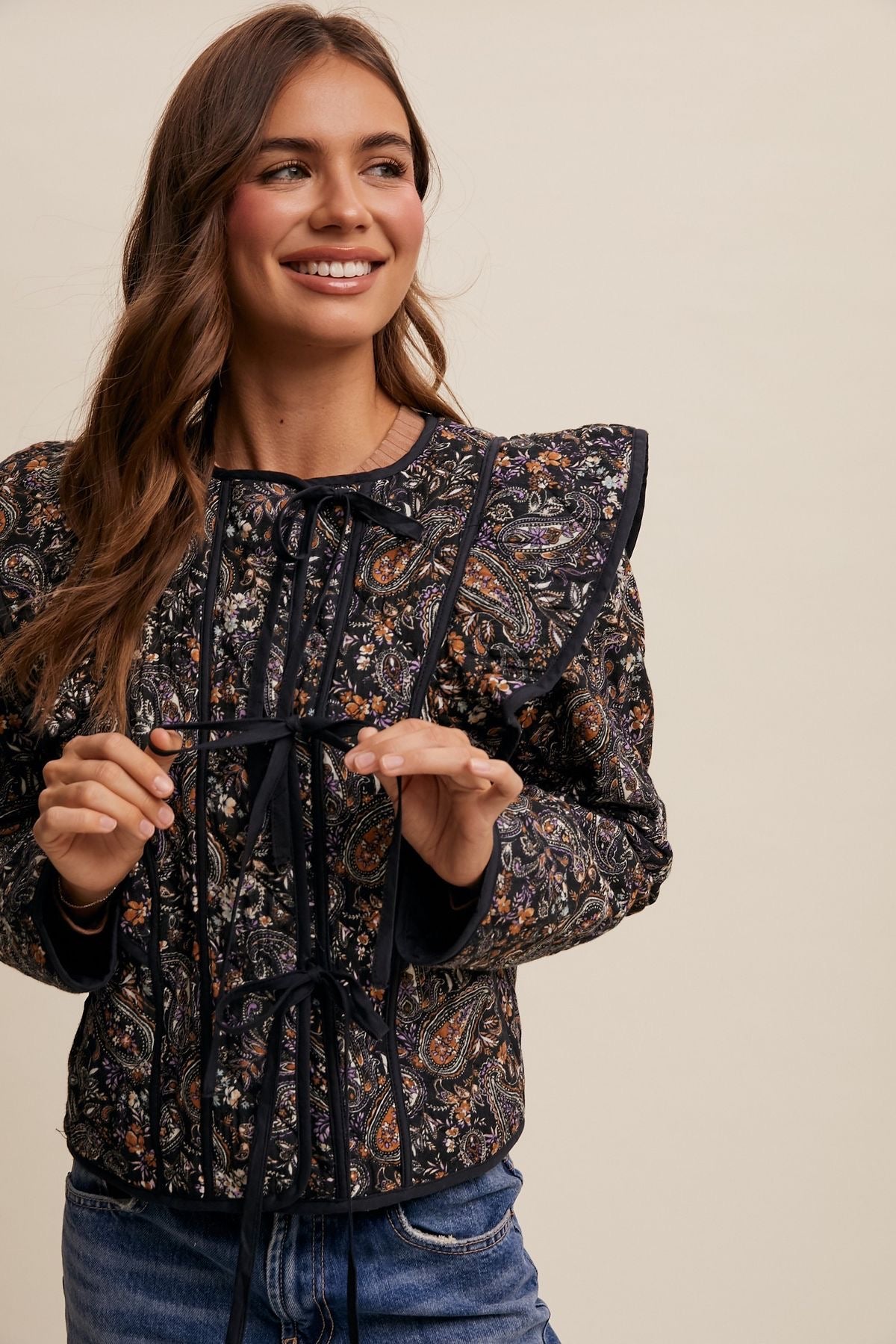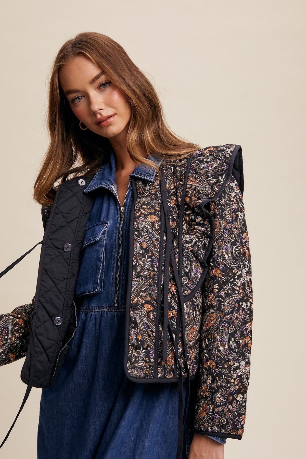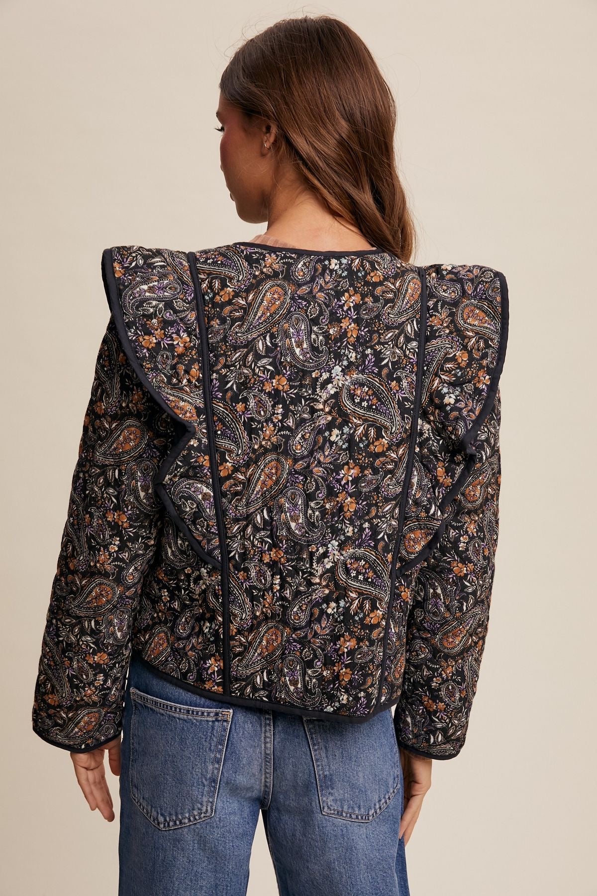 "Feminine and flirty, this Paisley Print Quilted Jacket is a must-have for any fashion-forward individual. The playful floral design is complemented by charming ruffle shoulders and back detail and a contrasting hem. Keep warm and stylish all at once with the addition of a tie front. Perfect for any weather!"
