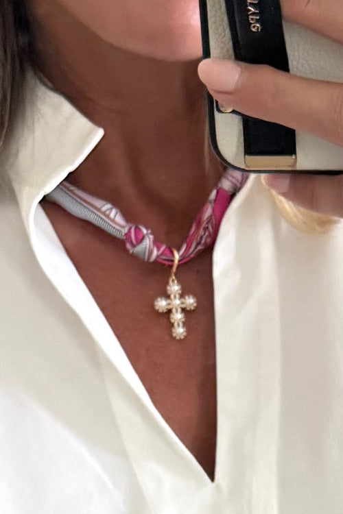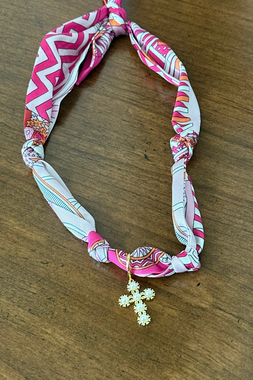 Versatile and stylish, the Pink Pearl Single Charm Scarf Necklace is a must-have statement piece. This best-selling design features a luxurious scarf adorned with a gold-plated CZ charm. Our beautiful scarf necklaces are Handmade in Dallas, TX. This unique accessory is perfect for layering or wearing as a statement piece, adding a chic and meaningful touch to any look.