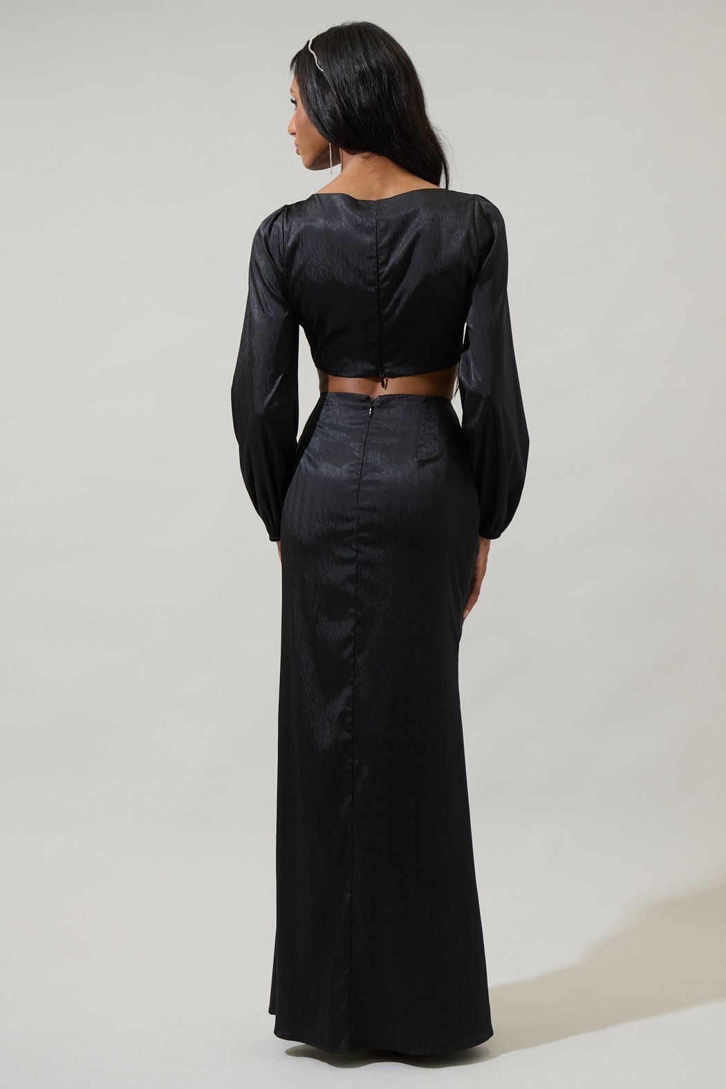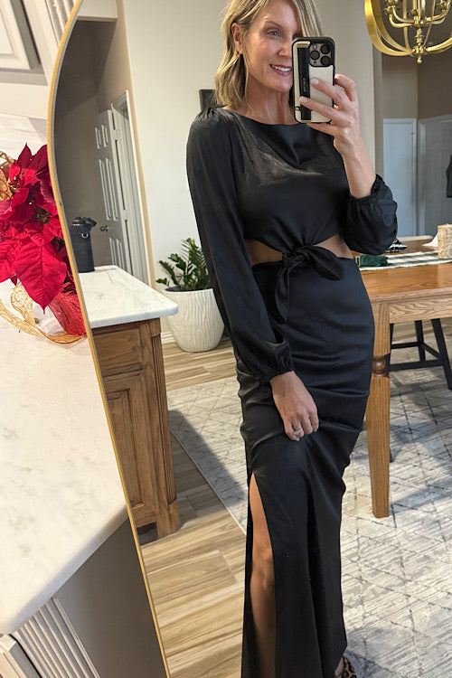 A satin silky, black stunner! This long maxi dress with a side, slit and side, cut outs, beautiful, long sleeve, so elegant and easy to wear.