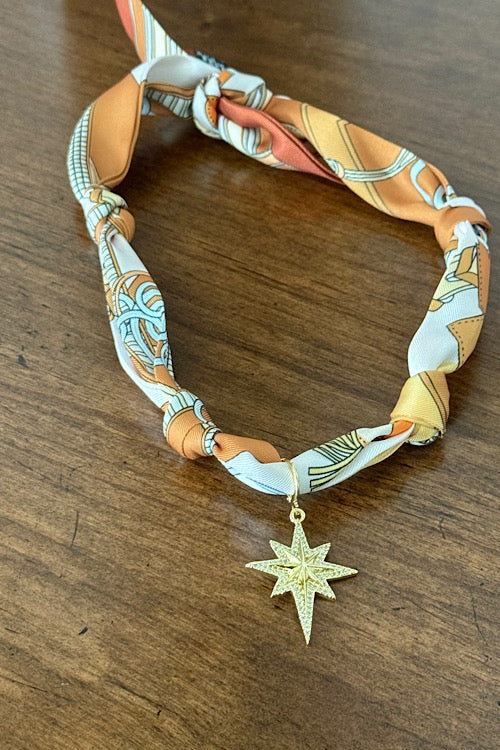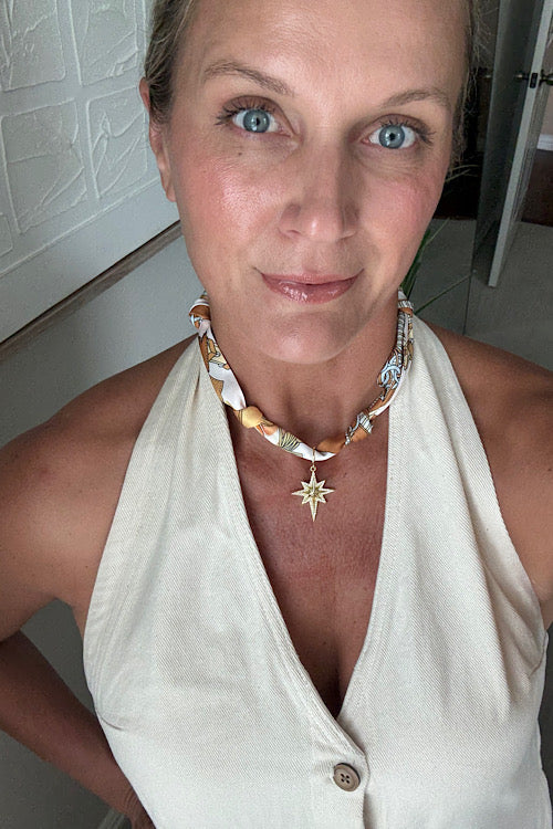 Versatile and stylish, the Tulum Single Charm Scarf Necklace is a must-have statement piece. This best-selling design features a luxurious scarf adorned with a gold-plated CZ charm. Our beautiful scarf necklaces are Handmade in Dallas, TX. This unique accessory is perfect for layering or wearing as a statement piece, adding a chic and meaningful touch to any look.